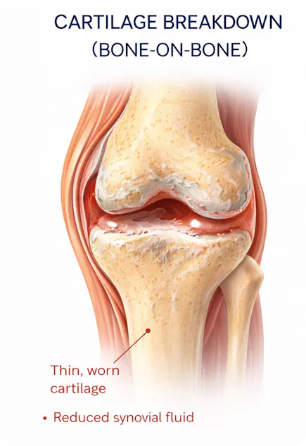 Over time, the cartilage that cushions your joints can gradually wear down, leading to increased friction — often described as “bone-on-bone” contact.